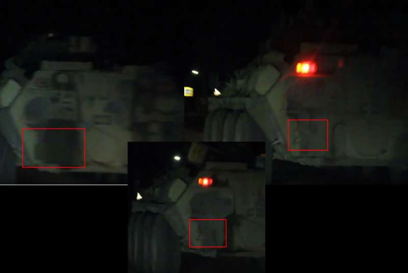 Если проиграть видео в замедленном режиме и внимательно присмотреться, то можно увидеть, что техника раскрашена в трёхцветный камуфляж. Номера на технике закрашены, но на 38-й секунде видео на одной из боевых машин можно увидеть первую цифру номера, которая по небрежности закрашена не была. Это цифра «2» и она тёмно-красного цвета.