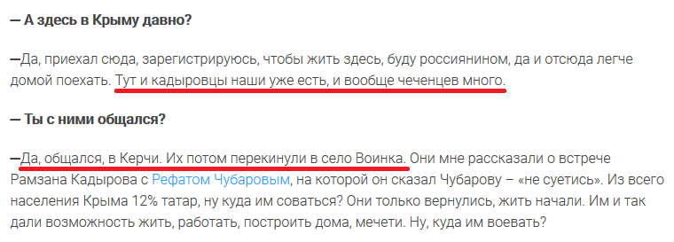 Во-первых, мы нашли интервью, опубликованное 11 марта 2014 г., в котором уроженец Чечни, находившийся на тот момент в Севастополе, упоминает о том, что в Крыму есть кадыровцы, которые вначале находились в Керчи, но затем их перекинули в Воинку: