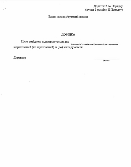3) оригинал или копия соответствующего документа об образовании (кроме учеников первого и второго классов): табель учебных достижений за соответствующий класс, свидетельство, другой документ, подтверждающий получение образования.
