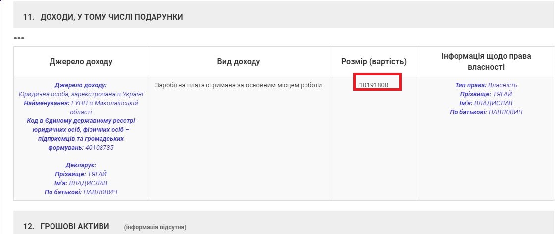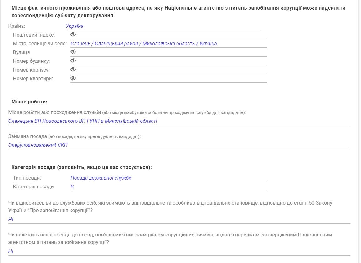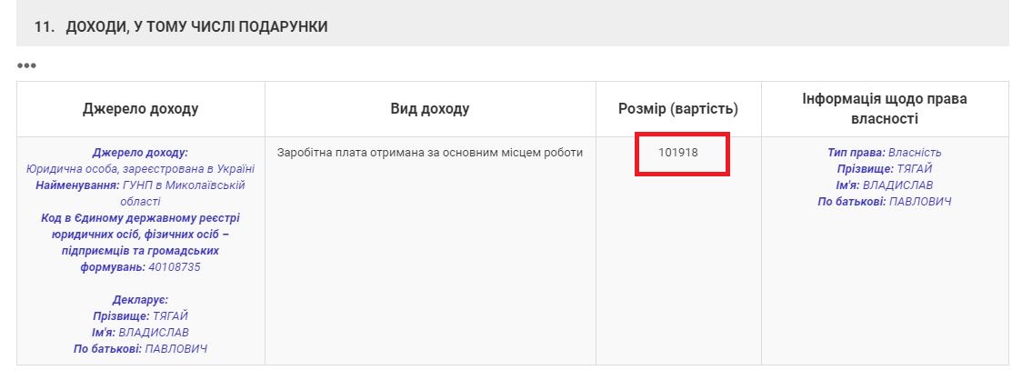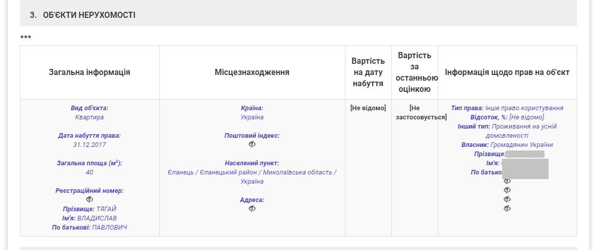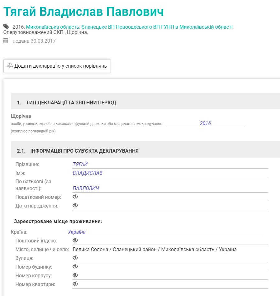 В 2017 году оперуполномоченный задекларировал, что проживает в квартире в Еланце по устной договоренности. Кроме того, он показал 10 191 800 грн зарплаты. Видимо, осознав, что поставил в декларации лишние нули, затем исправил ее на 101 918 грн.