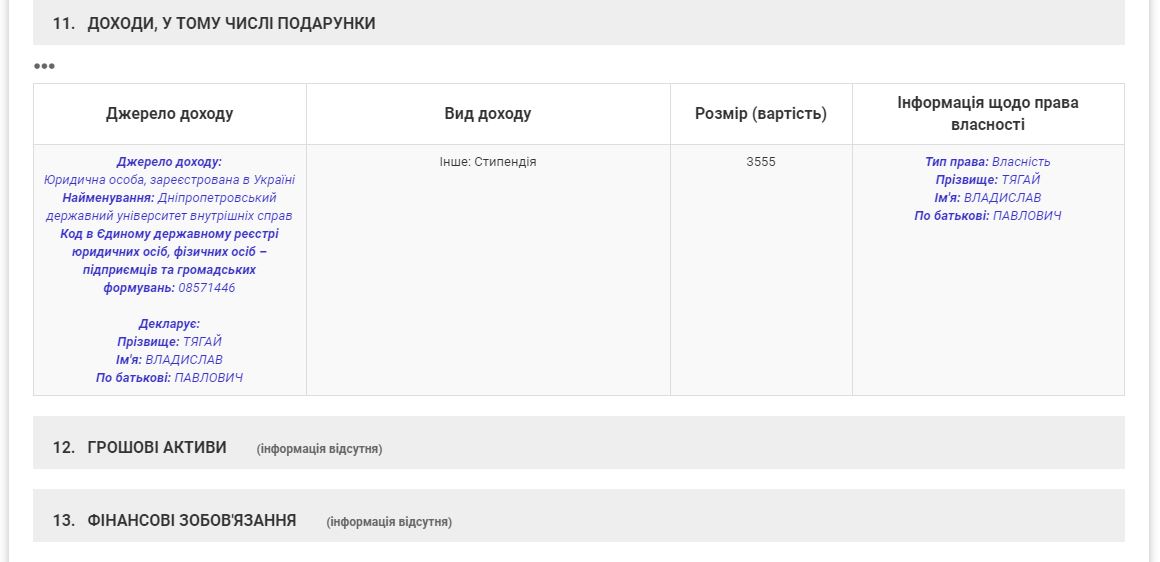 Отметим, что указанный в соцсетях Владислав подал декларации как оперуполномоченный Еланецкого отделения полиции. За 2016 год он показал стипендию 3 555 грн, полученных в Днепропетровском государственном университете внутренних дел.