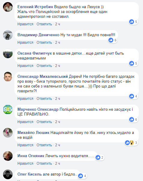 "Водила - быдло на Лехусе. Жаль, что полицейский за оскорбления еще один админпротокол не составил", "В машине детки, еще детей учит быть неадекватними", "Володька, тут не только полицейский считает, что ты бык, а и мы все так же", "Полицейский прав на 100%", - пишут украинцы в комментариях, которых уже насчитывается более 1,5 тысяч.