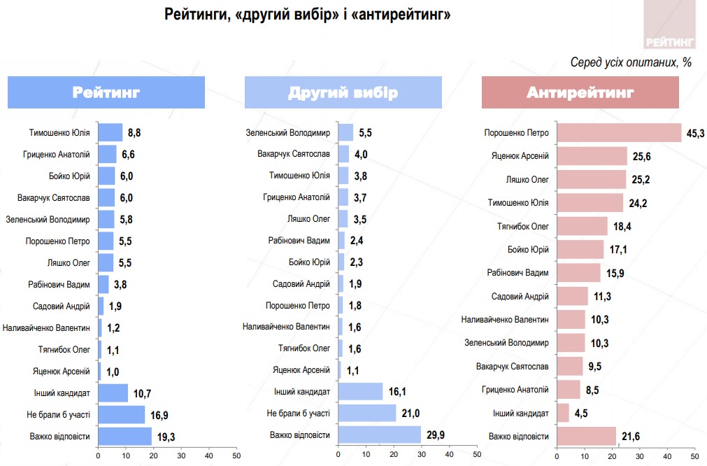 Среди тех, кто намерен голосовать и уже определился с выбором, поддержка кандидатов следующая: Тимошенко - около 14%, Гриценко - 11%, Порошенко, Бойко и Вакарчук - по 9%, Зеленский и Ляшко - по 8%, Рабинович - 6%.