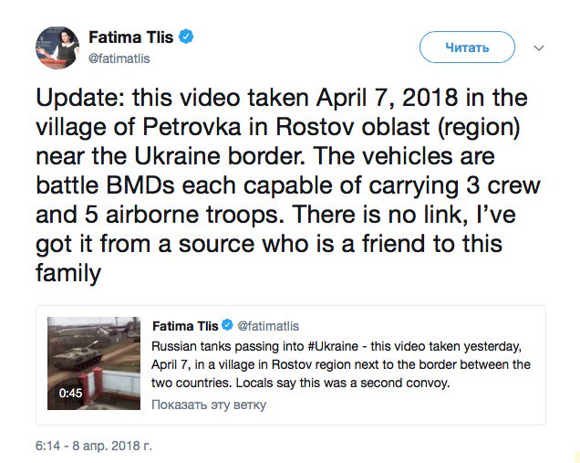 8 апреля журналистка «Голоса Америки» Фатима Тлис поделилась в сети видео, на котором якобы «российские танки заходят в Украину» в Ростовской области. Она не уточнила, где было снято видео, однако указала, что эта деревня находится возле границы с Украиной, и видео было снято недавно. На видео показана колонна российских БМП-3, говорится в расследовании лаборатории цифровой криминалистики «Атлантического совета» (DFRLab).