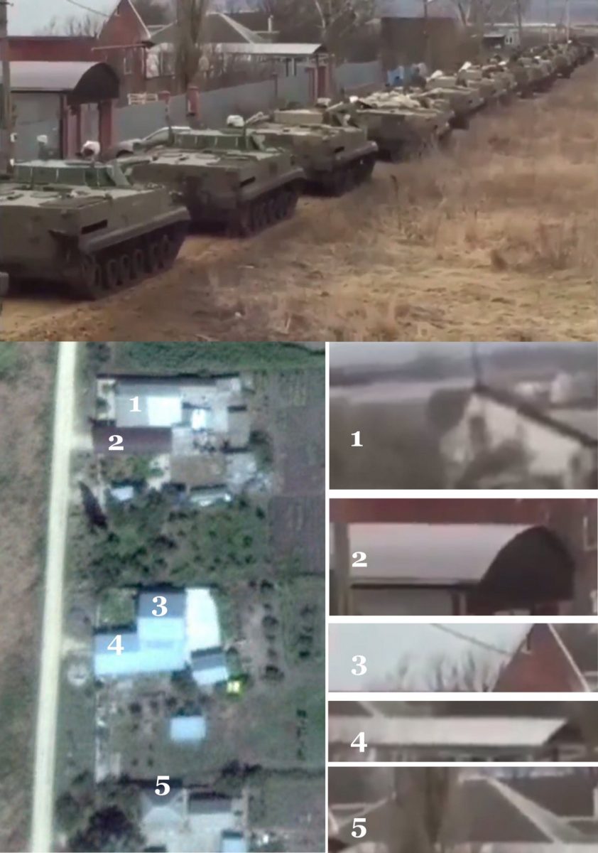 «Сравнив крыши, которые видно на видео, со спутниковыми снимками, мы подтвердили геолокацию: видео было действительно снято в этой деревне, а камера была направлена на юг», – отметили в DFRLab.