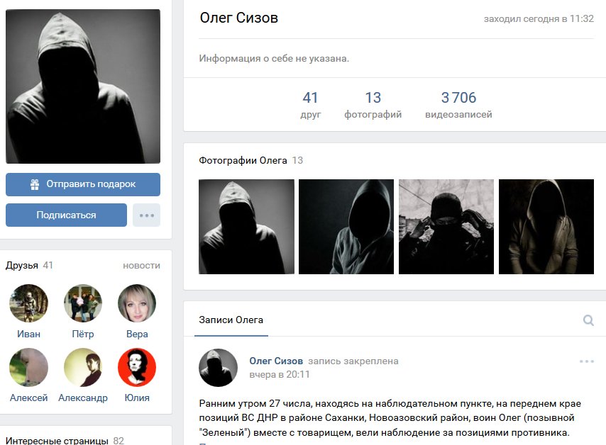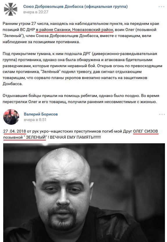 "Сизов Олег "Зеленый" (Лобня, 1988 г.р., данные требуют уточнения) погиб 27/04/18 под Саханкой", - сказано в сообщении.