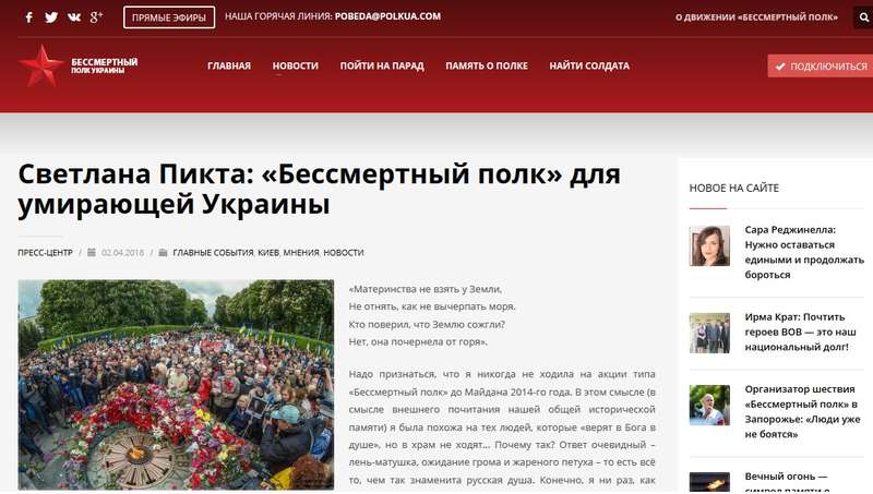 Организаторы координируют действия на сайте polkua.com. Интерактивная карта позволяет наблюдать связь адептов «русского мира» из Киева с уже оккупированными этим «русским миром» Луганском и Донецком. И они уже называют «Бессмертный полк» не акцией, а «движением». Приглашают помочь распространить баннеры и участвовать в агитации.