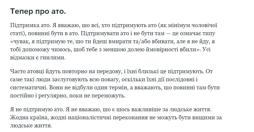 "Поскольку их действия последовательны и систематичны. Они не отбыли один срок, а считают, что должны там быть постоянно и регулярно, пока не победят. Я не поддерживаю АТО. Я не считаю, что есть что-то важнее человеческой жизни. Ни одна страна, никакие националистические убеждения не может быть выше человеческой жизни", — отметил он.