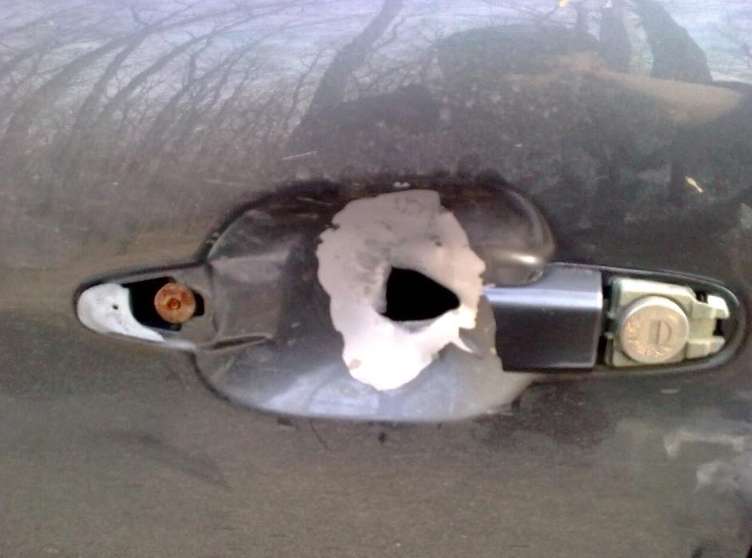 В Facebook он опубликовал фото пули и повреждений автомобиля.