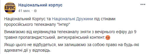 На своей странице в Facebook Нацкорпус сообщил, что от телеканала требуют "снять с вечернего эфира к 9 мая пропагандистский, антиукраинской контент".
