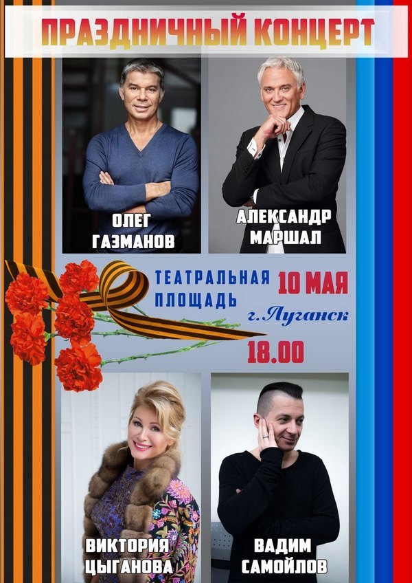 На оккупированной Россией части Донбасса 10-11 мая с концертами выступят российские артисты Олег Газманов, Александр Маршал, Виктория Цыганова, бывший лидер рок-группы "Агата Кристи" Вадим Самойлов и другие московские звезды.