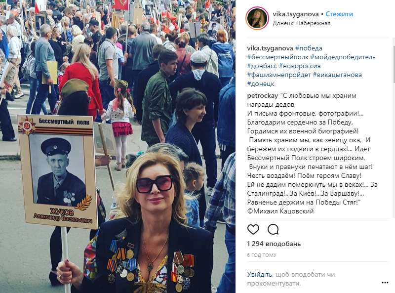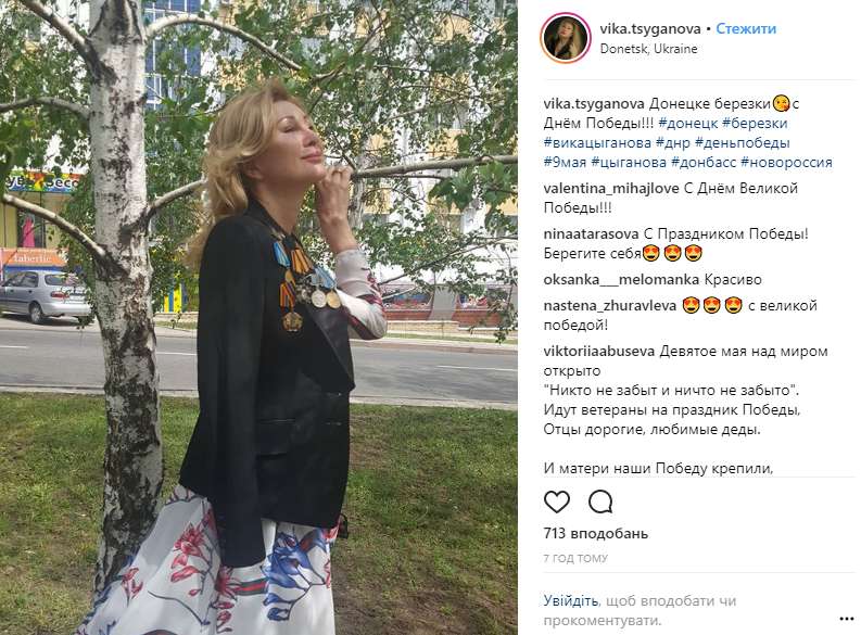 В свою очередь, Вика Цыганова опубликовала в соцсети фото из Донецка, где она позирует перед камерой в орденах и медалях.