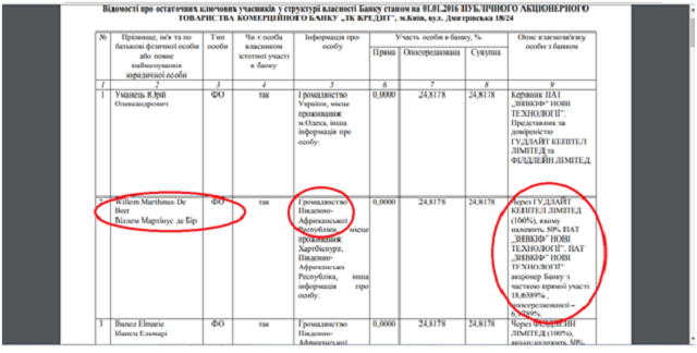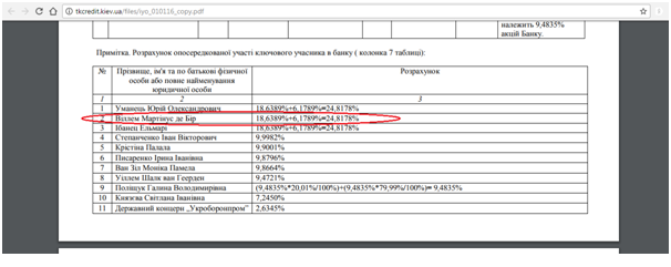 Так, по состоянию на 01.01.2016 де Бир числился собственником существенного участия с 24,8178% в многострадальном, находящемся в судебных разбирательствах с НБУ банке «ТК Кредит», что можно увидеть на официальном сайте финучреждения.
