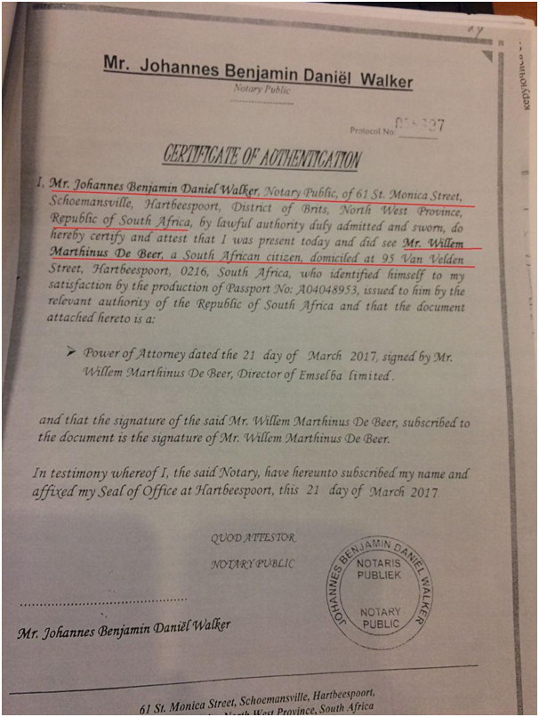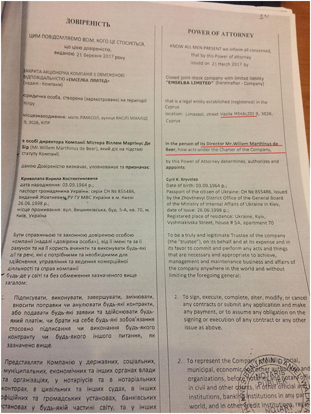 Г-н Криволап действовал как представитель ООО «Эмселба лимитед», по доверенности от де Бира. Доверенность на Криволапа была выписана Виллемом Мартинусом 21 марта 2017. А заверена нотариусом из ЮАР. Доверенность на английском, апостилирована, а это, по словам украинских экспертов-юристов, означает, что вряд ли в Украине ее кто-то действительно будет проверять.