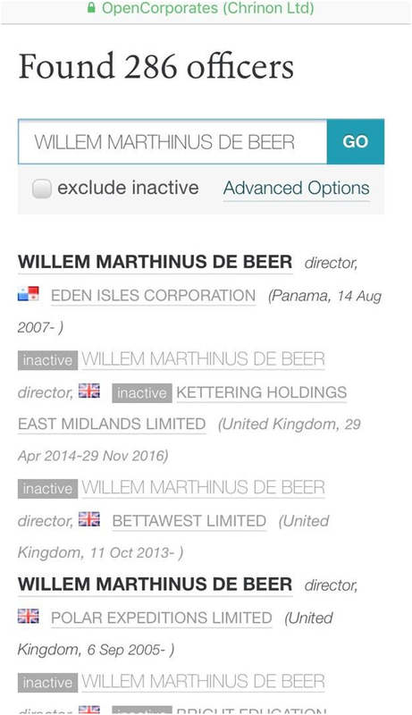 Но это далеко не все заслуги гражданина ЮАР. Виллем Мартинус де Бир – птица высокого полета, не отставая от мировой «элиты», предприимчивый африканец успел засветиться и в небезызвестном скандале «Панамагейт». Среди слитых терабайтов документов панамской юрфирмы MossackFonseca, раскрывающих скрытые активы политиков и олигархов, фигурирует уже известное нам имя. Всего, по данным «оффшорликс» де Бир является должностным лицом в 286 компаниях в различных юрисдикциях. И это не считая его украинского бизнеса.