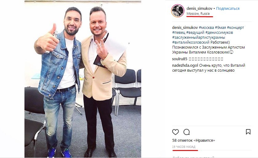 Также фотографией с Виталием Козловским поделился российский ведущий Денис Симуков. "Познакомился с Заслуженным Артистом Украины Виталием Козловским!" - прокомментировал он фото, также отметив его хештегами #москва #9мая #концерт