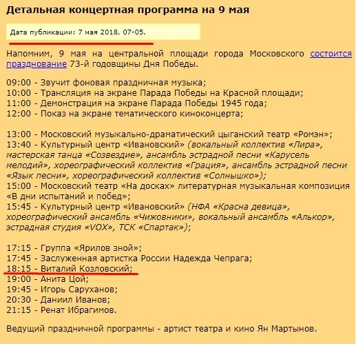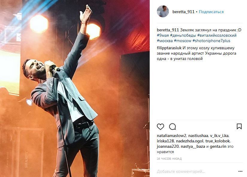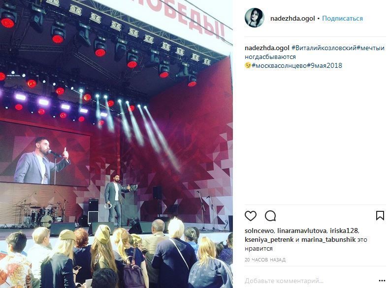 В среду, 9 мая, в московском районе Солнцево на сцене концерта ко Дню победы был замечен украинский поп-певец, заслуженный артист Украины Виталий Козловский.