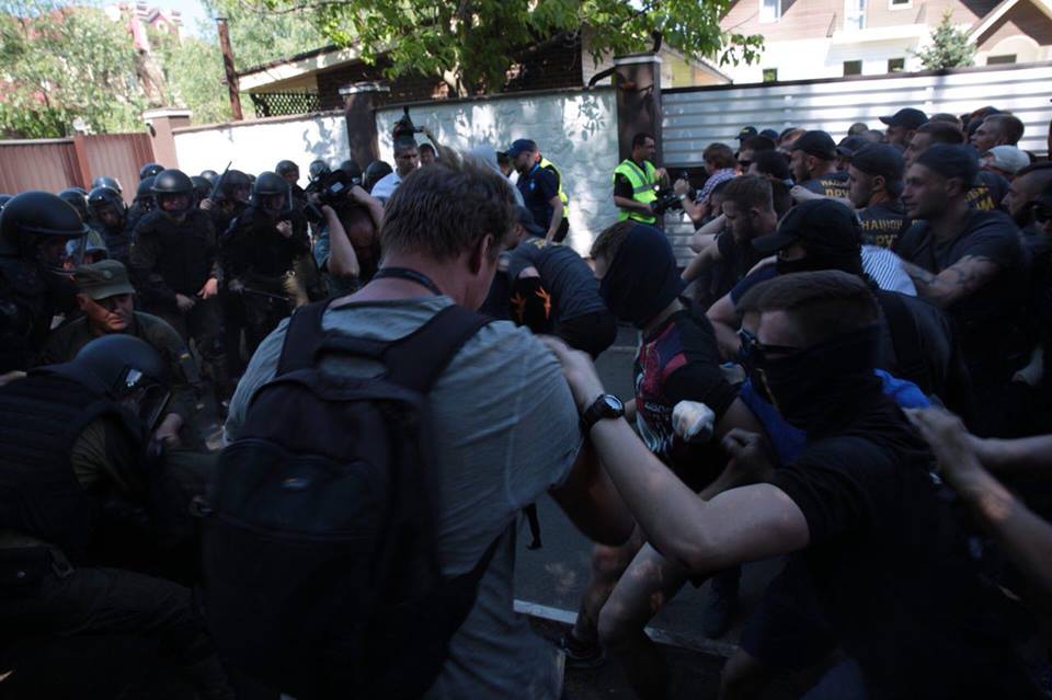 Прибыв на место, активисты решили выяснить, почему перегорожен доступ к водоему местных жителей. Представители «Нацкорпуса» попытались оттеснить стражей порядка, которые выстроились возле дома нардепа, и снести забор вокруг водоема. В результате завязалась драка между активистами и правоохранителями. В частности, неизвестные распылили слезоточивый газ, также были слышны взрывы светошумовых гранат, передает агентство «Интерфакс-Украина».