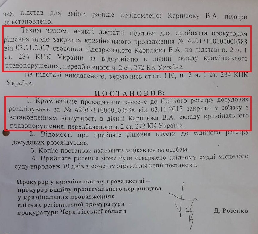В результате, громкое дело по Карплюку, а именно - уголовное производство за правонарушения (преступление), предусмотренное ч. 2 ст. 272 Уголовного кодекса Украины (нарушение правил безопасности во время выполнения работ с повышенной опасностью, повлекшее гибель людей и другие тяжкие последствия), в начале мая этого года было закрыто.