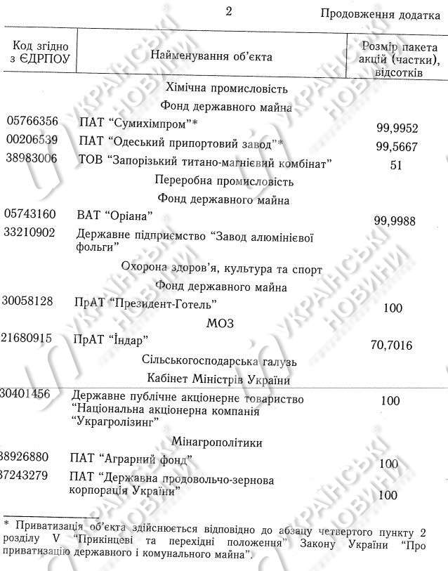 Согласно распоряжению, 18 объектов находятся в управлении ФГИ: энергопоставляющие компании "Тернопольоблэнерго", "Запорожьеоблэнерго", "Харьковоблэнерго", "Николаевоблэнерго", "Хмельницкоблэнерго", теплоэлектроцентрали (ТЭЦ) - Херсонская ТЭЦ, Днепровская ТЭЦ, Криворожская ТЭЦ, Северодонецкая ТЭЦ, "Азовмаш", "Турбоатом", Запорожский титано-магниевый комбинат, "Ориана", Завод алюминиевой фольги, "Президент-Отель", "Центрэнерго", Одесский припортовый завод и "Сумыхимпром".