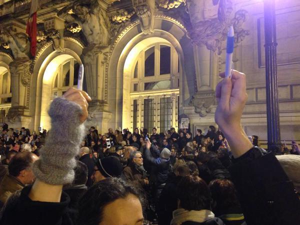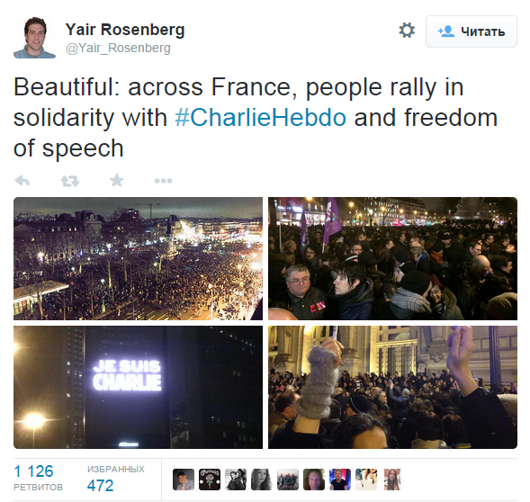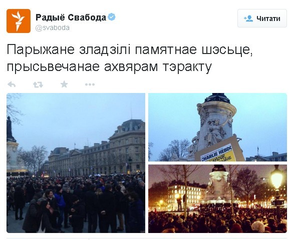 По сообщению белорусского "Радио Свобода" в Twitter, несколько тысяч французов скандируют "Мы не боимся!".