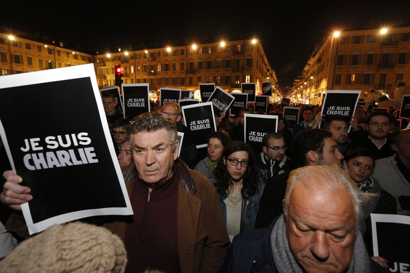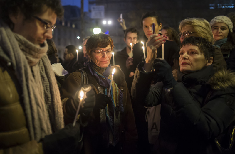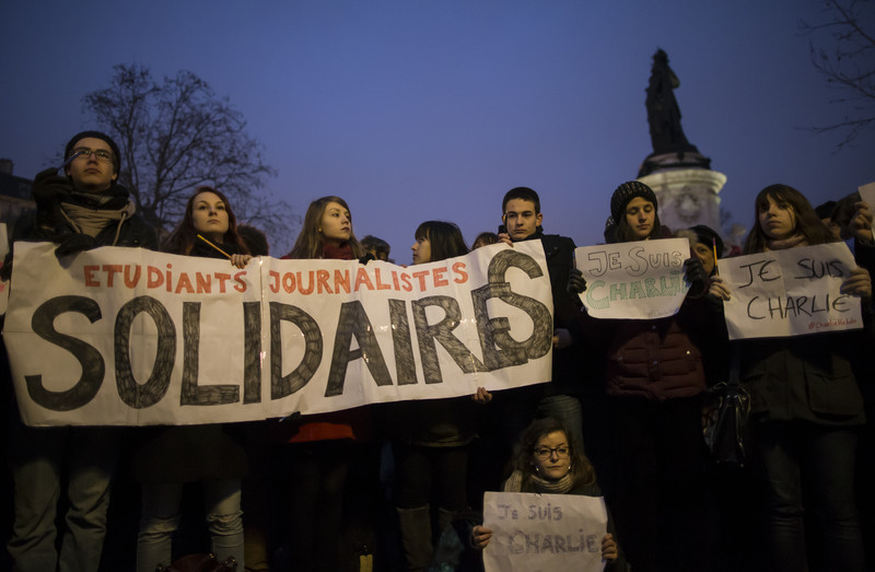 На площади Республики в Париже в знак солидарности с семьями погибших и пострадавших в результате нападения на редакцию сатирического журнала Charlie Hebdo проходит многочисленная манифестация.
