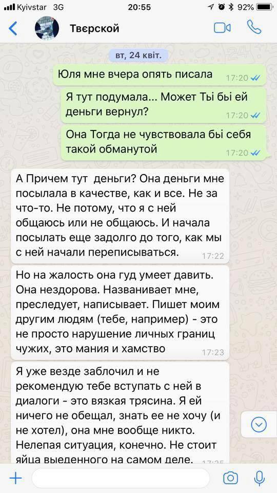Вся суть заключается в том, утверждает она, что Тверской под видом того, что он терпит гонения в РФ из-за своей проукраинской позиции, регулярно просил о помощи у неравнодушных и якобы спекулировал этим.