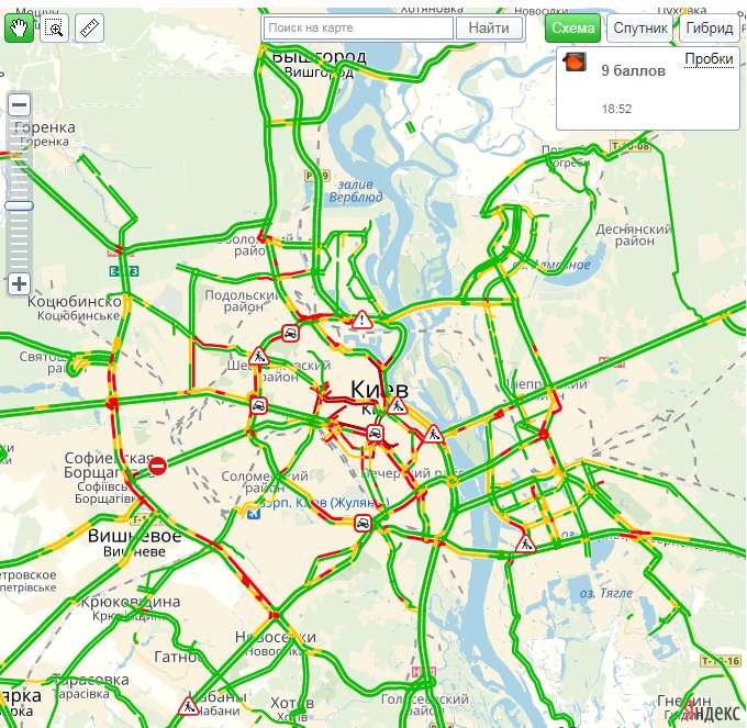 По данным Google Карт, больше всего движение затруднено в центре. Так, дорога практически стоит на проспекте Победы, бульваре Тараса Шевченко, на улице Бассейная, бульваре Леси Украинки и Большой Васильковской.