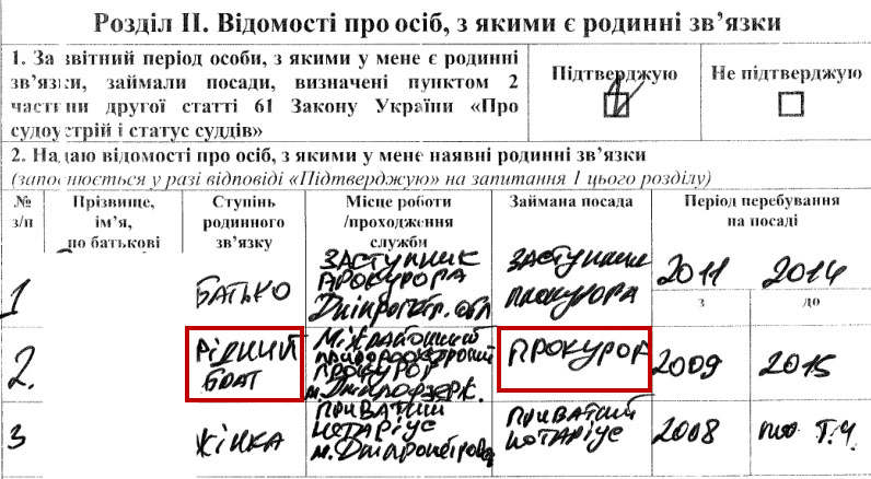 Также известно, что у судьи есть брат, который тоже работал прокурором с 2009 по 2015 годы. На сайте прокуратуры Днепропетровской области размещены отдельные декларации Дениса Рычки.