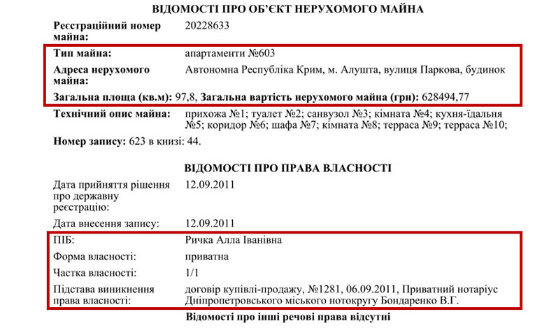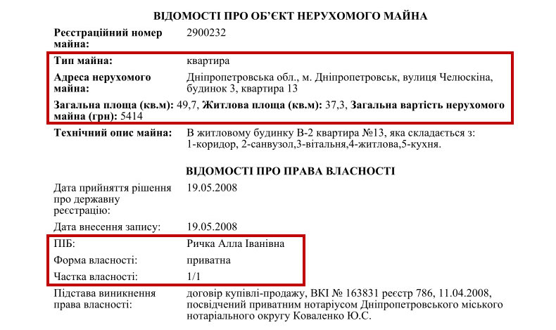 Из текста решения следует, что еще в 2005 году Алла Ивановна инвестировала в 4 квартиры в новостройке более 3,8 млн грн. Именно тогда Алла Рычка работала в отделе образования Амур-Нижнеднепровского районного совета города Днепропетровска (ныне Днепр). Вряд ли заработной платы государственного служащего ей хватило бы на приобретение этих элитных квартир в столице.