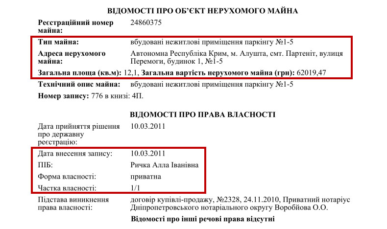 Во-первых, она владеет апартаментами в Алуште, нежилым помещением в Крыму, приобретенным на основании договора дарения, и паркингами.