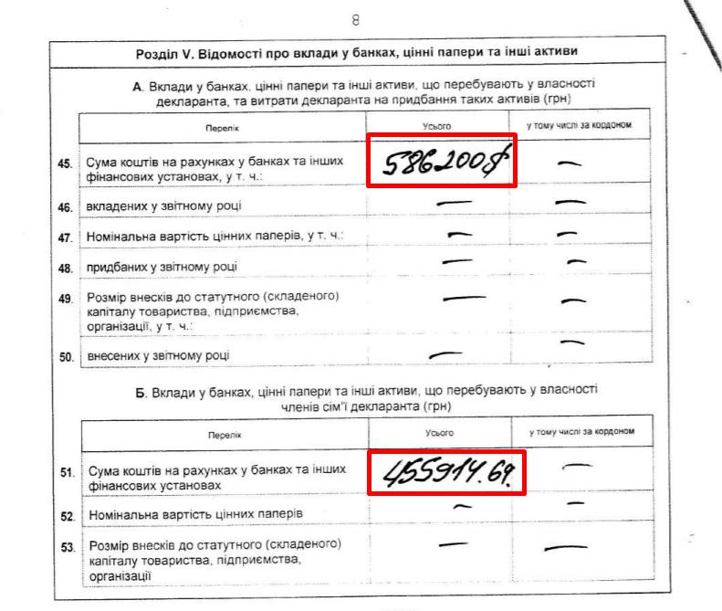 То есть, заработки семьи действительно неплохие. Но даже при таких заработках нас очень удивили сбережения судьи. С 2012 года судья декларирует более чем полумиллионный депозит. Согласно декларации за 2014 год, у судьи на банковских счетах было 586 200 долл. США. А у жены 455 914 грн.