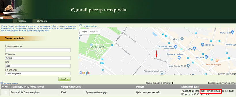 Как мы уже отмечали, жена судьи является частным нотариусом. А особенностью нотариальной деятельности является необходимость иметь нотариальную контору, где осуществляется такая деятельность. К помещениям нотариальных контор даже есть специальные требования. Поэтому Юлия Александровна однозначно должна оформлять права на помещение, где находится ее контора. Согласно Единого реестра нотариусов она расположена по адресу г. Днепр, ул. Челюскина, 3 кв. 13.