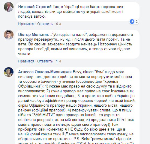 Данный пост вызвал массу критики и споров пользователей Сети. Жители Обухова и области разделились на тех, кого возмутил такой комментарий чиновницы, и тех, кто горячо поддерживал экс-замглавы райрады. "Кому это надо", " У народа спросили", "Некуда тратить деньги", - пестрели комментарии сторонников Олковой-Михницкой. В то же время защитники флага утверждали, что данный флаг имеет великую историю и должен быть установлен в обязательном порядке. "Под этим черно-красным флагом у меня на глазах погибали мои товарищи. Думай, что пишешь", - возмутился Владимир Дубровский.