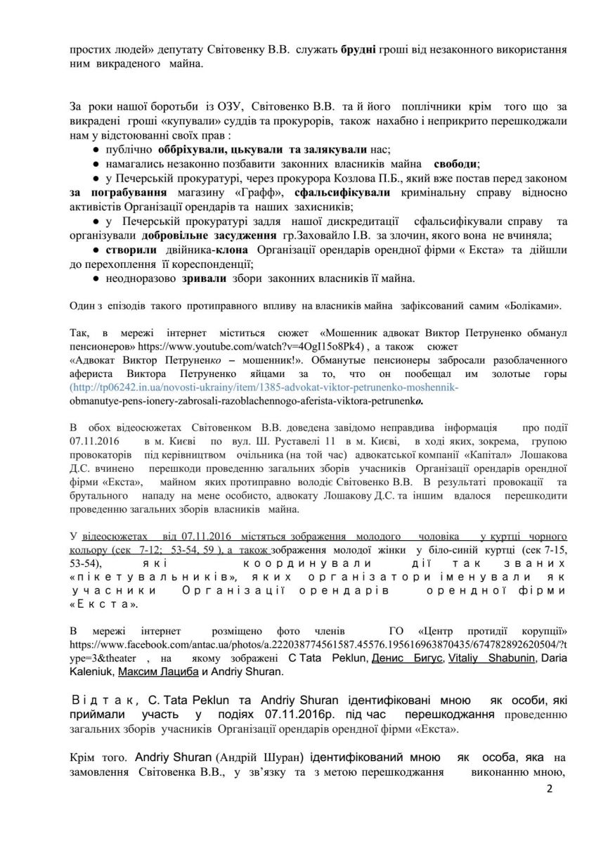 “Просматривая видеозаписи касательно поджога, я осознал, что где-то уже видел молодого человека, которого зафиксировали камеры наблюдения с места событий. Решение о поджоге автомобиля Свитовенко В.В. принимал по результатам заседания хозяйственного суда от 26.02.2018 года, следовательно, по времени он не мог привлечь посторонних лиц. Для скоропалительной реализации должны быть «свои». И мне удалось идентифицировать поджигателя по видеозаписям в интернете - 7 ноября 2015г. группа провокаторов под руководством адвоката Лошакова Д.С. препятствовала проведению общего собрания законных собственников здания по ул. Ш. Руставели, 11. И именно будущий поджигатель, который являлся одним из координаторов «массовки», был запечатлен на видео их собственного производства. Впоследствии его я идентифицировал как Андрея Шурана, активиста Центра противодействия коррупции, которым руководит Виталий Шабунин» - говорит Виктор Петруненко.