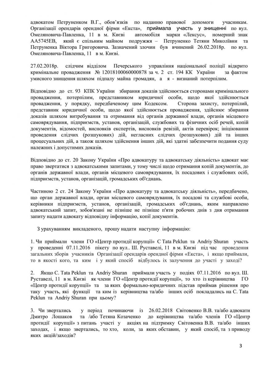 После идентификации подозреваемого в поджоге Петруненко отправил запрос руководителю Центра противодействия коррупции Шабунину В.В. с информацией о причастности Андрея Шурана к событиям февраля 2018 года, а также ноября 2015 года под стенами злополучного здания. Запрос был отправлен 8.05.2018, ответ Петруненко пока не получил. То ли долго разбираться, то ли не знают, как ответить на вопросы о роли руководства Центра в проводимых его членами акциях - в ноябре 2015г. Кроме Андрея Шурана законным собственникам здания противостояли еще несколько активистов Центра.