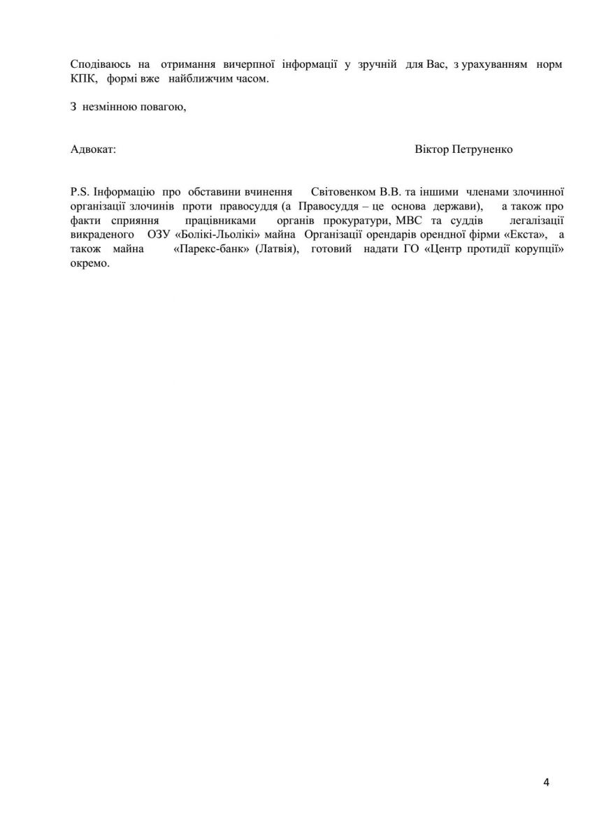 В ходе многолетних разбирательств адвокат неоднократно заявлял о манипуляциях и попытках повлиять на исход дела через подкуп судей, шантаж и другие неправомерные действия незаконного владельца помещения и его доверенных лиц. По словам Петруненко, в 2011-2012 годах, Свитовенко В.В. вместе с руководителями юридической компании “Капитал” Козаченко Т.А. и Лошаковым Д.С. создали преступную организацию, члены которой совершили ряд тяжких и особо тяжких коррупционных преступлений против правосудия.