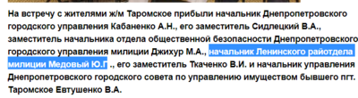 Однако судя по информации, которую мы обнаружили в открытом доступе, в 2014 году начальником Таромского районного отделения (тогда Ленинское) был подполковник Медовой Юрий Григорьевич. Пока что неизвестно служит ли он в полиции до сих пор.