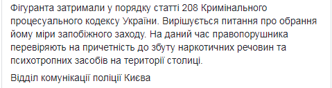 Фигуранта задержали в порядке статьи 208 Уголовно-процессуального кодекса Украины. Решается вопрос об избрании ему меры пресечения. В настоящее время правонарушителя проверяют на причастность к сбыту наркотических веществ и психотропных средств на территории столицы.