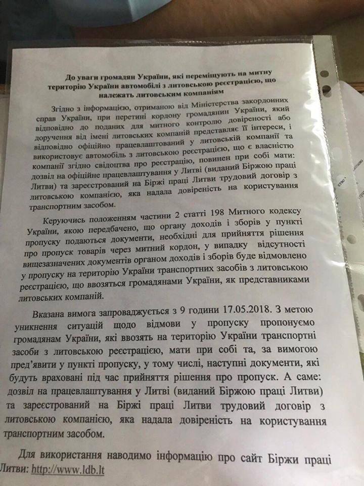 По его словам, МИД, который получил эту информацию, передал ее таможне, а на таможне появилось письмо для граждан Украины, что у них с собой должно быть разрешение на работу в Литве, которое стоит 120 евро в год, плюс заверенный на бирже труда в Литве контракт между лицом, которое ввозит машину, и фирмой, которой, конечно же, нет, поскольку тогда придется платить налоги государству.
