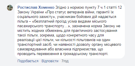 "Согласно норме пункта 7 ч.1 статьи 12 Закона Украины "О статусе ветеранов войны, гарантиях их социальной защиты", участникам боевых действий предоставляется льгота - "бесплатный проезд всеми видами городского пассажирского транспорта...". Указанная норма Закона не содержит никаких ограничений для практического применение такой льготы, в частности, конкретного времени для реализации этой льготы, или количества льготников на одно транспортное средство, или наличии разрешения органа местного самоуправления или владельца предприятия, что проводит перевозки в общественном транспорте", - написал Ростислав Хоменко.