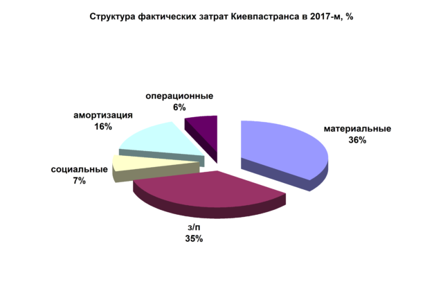 В 2017-м, 35% затрат составила заработная плата (663 млн. грн.), 36% — материальные затраты, в том числе на покупку энергоносителей (655 млн. грн.), 7% — социальные (133 млн. грн.), 16% амортизация (297 млн. грн.), 6% — операционные (112 млн. грн.). Таким образом, доходов от перевозки платных пассажиров (570 млн. грн.) почти хватает на выплату заработной платы персоналу, а вот для закупки топлива и ремонта уже нужны государственные дотации.