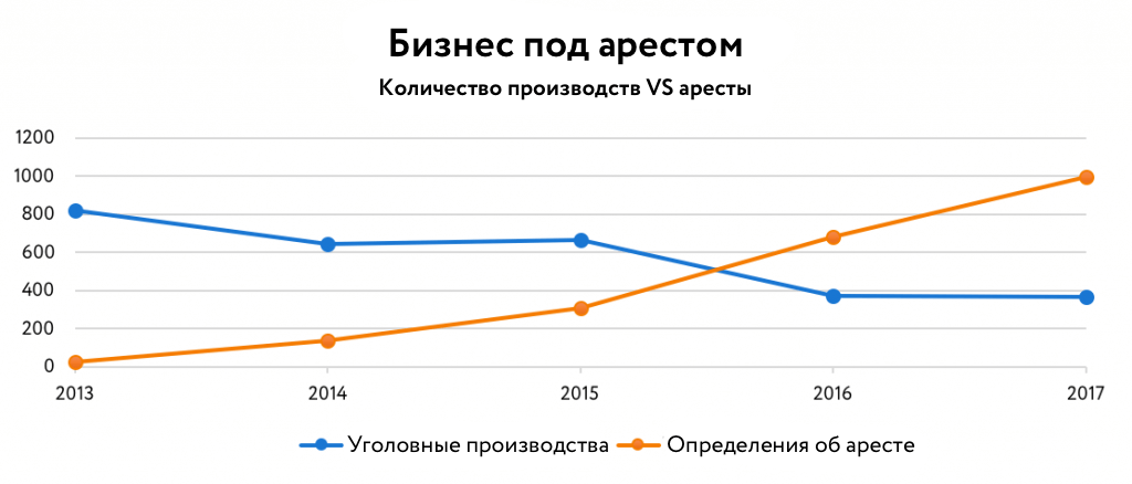 Например, в 2014 году киевские суды приняли 136 решений об аресте имущества, а в следующем году уже 308. Такому скачку нет очевидного объяснения, ведь законодательство в указанный период принципиально не пересматривалось. Ощутимые изменения УПК в части наложения арестов состоялись в декабре 2015 года: арестованное имущество может считаться предметом, доказательством или орудием преступления. Эта «поправка» вызвала новую волну арестов: в 2016-м количество удовлетворённых ходатайств следователей о наложении имущественного ареста достигло почти 700. Показательным стал 2017-й год: законодательное поле осталось неизменным, но произошел новый скачок количества арестов — на 50%.