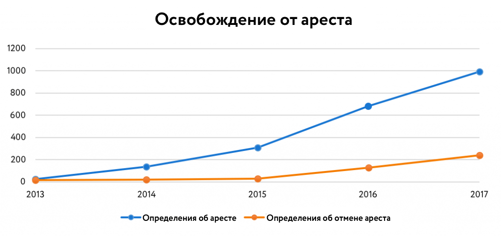 • Объяснить рост только изменениями в законодательстве невозможно — инструмент «ареста по определению» внедрили в 2012-м, существенные изменения вносили только в декабре 2015-го.