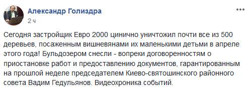 Сообщается, что деревья уничтожили вопреки договоренностям о приостановке работ и предоставлению документов, гарантированным на прошлой неделе председателем Киево-Святошинского районного совета Вадимом Гедульяновым.