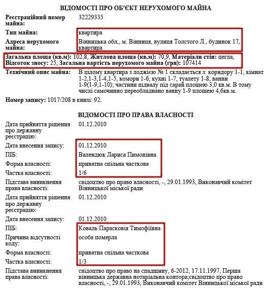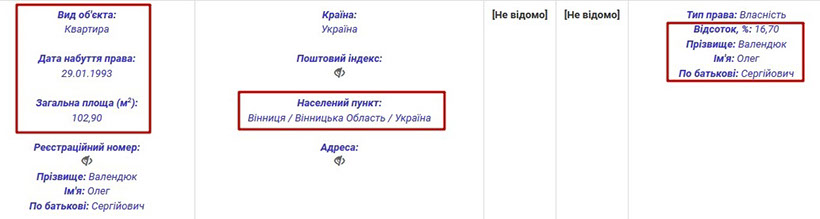 Поскольку Олег Валендюк родом из Винницы, то там у него осталась квартира площадью 102 кв. м. В электронных декларациях 2015 и 2016 годы он отметил, что является владельцем 16,7% этого жилья с 1993 года. Поэтому не-декларирование квартиры в своих декларациях за 2013 и 2014 годах может свидетельствовать о попытке скрыть свои доходы. В Реестре прав на недвижимое имущество можем увидеть, что другими владельцами этой квартиры являются родственники Олега Сергеевича, в частности, его мать Лариса Пимоновна Валендюк.