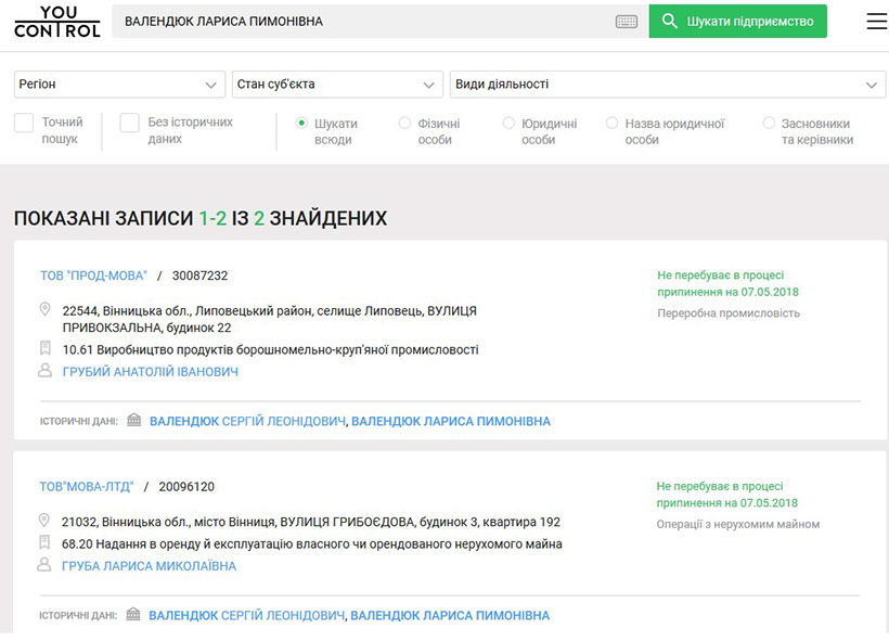 Мы удивились, откуда у матери прокурора более 10 млн грн на приобретение элитной недвижимости. Благодаря аналитической системе You control нам удалось обнаружить, что в 2011 году Лариса Пимоновна была соучредителем ООО «МОВА-ЛТД», а также значилась среди соучредителей ООО «Прод-мова».