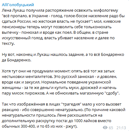 "Хотя тут они не продумали момент: опять все тот же затык нестыковки менталитетов. Это русский занюхал - и доволен, вроде как и закусил. Нормальное поведение украинской женщины - за те же деньги купить муки, дрожжей и напечь пару мисок пирожков. А не обнюхивать магазинную "сдобу", - подчеркнул он.