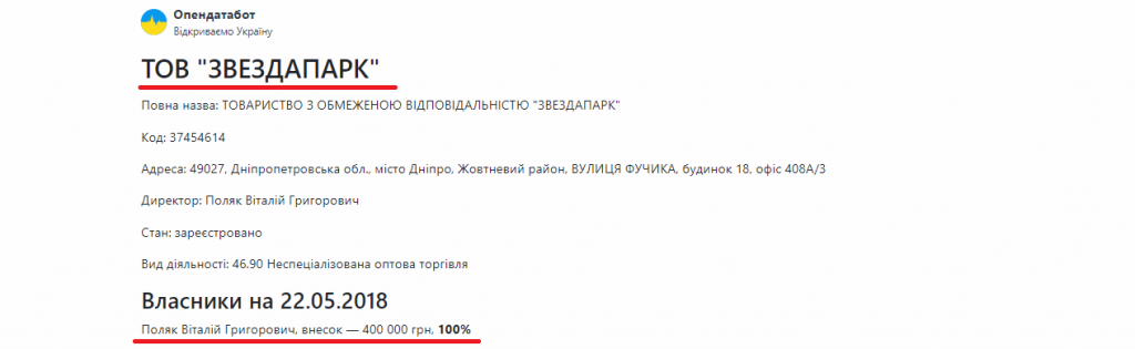 Відмовляючи Промінвестбанку у поверненні відсотків за кредитом, компанія Бродського в лютому 2017 року уклала мирову угоду з іншою дніпровською компанією – ТОВ «Звездапарк», якій повинна понад 45 млн грн. Визнавши борг у повному обсязі, «Велта» зобов’язалася погасити його за 11 платежів, щомісяця переказуючи «Звездапарку» понад 4 млн грн. Примітно, що «Звездапарк» оформлений на якогось Віталія Поляка, який нещодавно числився серед засновників компанії «Велта Трейдинг».
