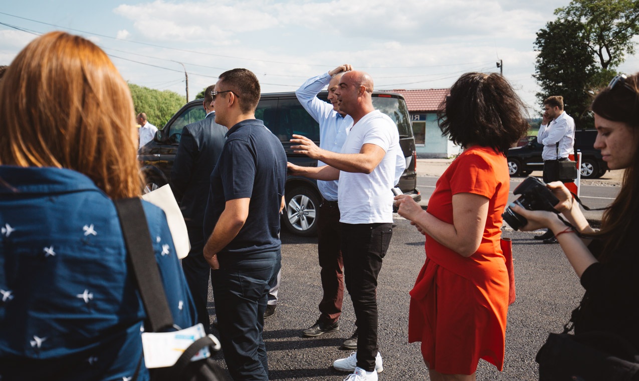 За ним – купа фотокореспондентів та операторів, які буквально обсіли машину попри те, що вона продовжувала рухатися. Гройсман натомість не став сідати за кермо, а просто поспілкувався з працівниками та потис кожному руку.